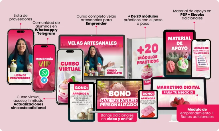 ¡Haz tu compra hoy y recibe acceso inmediato a +85 clases paso a paso para crear velas únicas desde casa! Además, desbloquea nuestro exclusivo curso en video y empieza a transformar tu pasión en un verdadero arte. ¡No dejes pasar esta oportunidad!